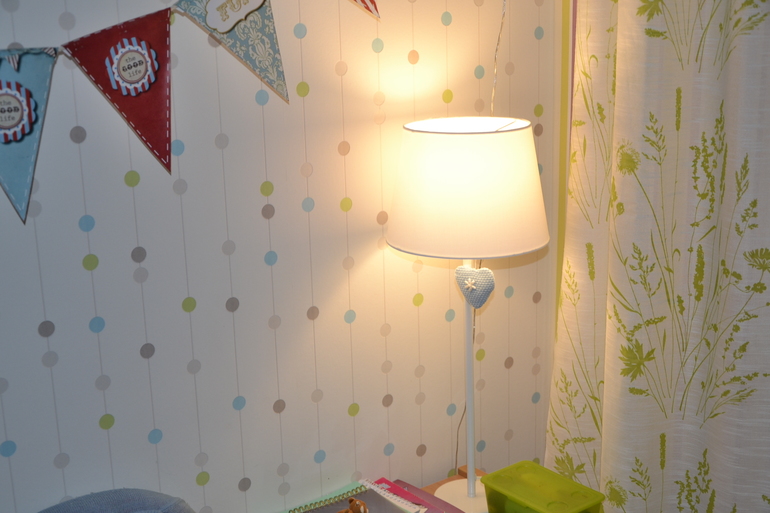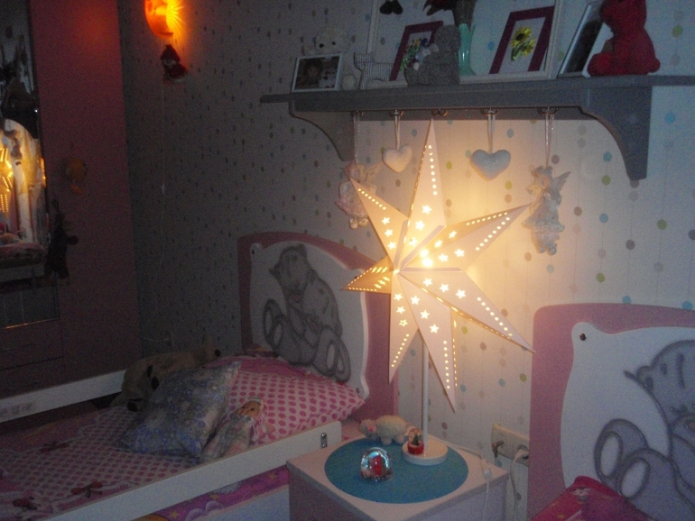 Зима прошла, звезды убрали далеко в шкаф до следующего года. И буквально на днях ко мне пришло озарение - а почему в другое время года нельзя использовать основания звезд в комплекте с обычными абажурами в качестве настольных ламп? Сказано- сделано! Одна лампа в детской:
