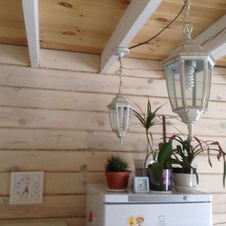 ☺Спрашивайте- ответимДобрый день! Построили дом-дачу из бруса. Не могу вырисовать картинку кухни на фоне брусовой стены (фото). Потолок деревянный в натуральном цвете, балки выкрашены укрывистой белой матовой краской, стены покрыты матовым лессирующим составом с белесым оттенком, пол шпунтованная доска выкрашена укрывистой белой краской для пола, над зоной кухни висят четыре белых металлических светильника с потертостями. Сначала хотела кухню по типу Стот Икеевский, но потом посчитала что слишком много полосчатость в доме, так как стены сами по себе сложные полосатые. Стала смотреть кухни с простым ровным фасадом белого цвета, без фасок и прочих рамочек тоже что то не вяжется у меня с брусом и светильниками. Поделитесь своими фото кухонь на фоне таких стен пожалуйста.