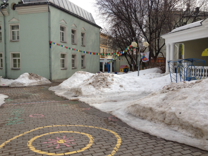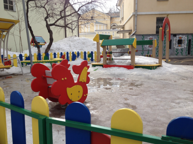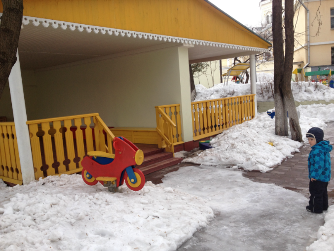 Думаю, понятно, что "малых архитектурных форм" вполне достаточно для игры детей на улице в любую погоду. К этому прибавляем 3 корзины игрушек для улицы, 20 лопаток, 20 ледянок на которых дети постарше катаются с горок-сугробов. Прогулки в обязательном порядке 2 раза в день по 2 часа. Исключение: температура -15 (прогулки просто короче) и шквальный ветер. Мой ребенок в ясельной группе, поэтому гуляют чуть меньше из-за того, что всех деток приучают самостоятельно одеваться. После прогулки одежда развешивается в специальныйй шкаф где кочегарит батарея и все отлично высыхает. На прогулке детям почти ничего не запрещают. Воспитатели участвуют в играх: каждый день вижу что-нибудь новое: стена из снежных комьев, снеговик, просто куча формочек и т.д. Когда мы пришли в сад, наша детская ясельная площадка была закрыта на карантин!!!! из-за ветрянки! Дети ходили гулять в гости к другим группам. Про прогулки вроде все.