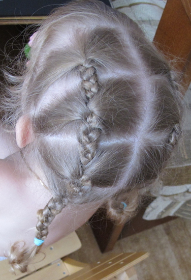 щас на наши хвостики панамка не налазиет беда прям.надо придумывать косички очень понравилось фото 1 и 2 по бокам косы с резинками .сидела бы доча не дергалась(утром мало времени да и капризы