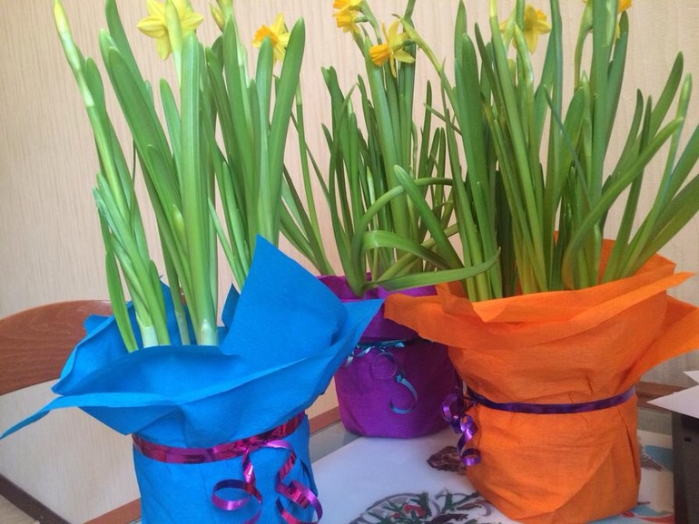 Родительский комитетТоже покажу. Мы воспитателям вместо букетов, подарили вот-такие нарциссы. Смотрятся ярко и по весеннему, да и по цене очень приятно. Горшки обернула гофробумагой. Вместо ленты хотела что-то типа рафии или бумажной веревки накрутить, но забыла отмотать в магазине.