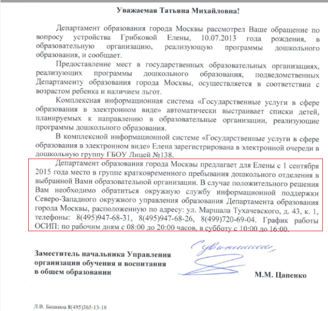 Это ответ на ваше обращение от Департамента образования г.Москвы, когда обратитесь в ОСИП вам ещё придёт письмо, что вы направлены в ГКП, и статус заявления на мос.услугах поменяется.