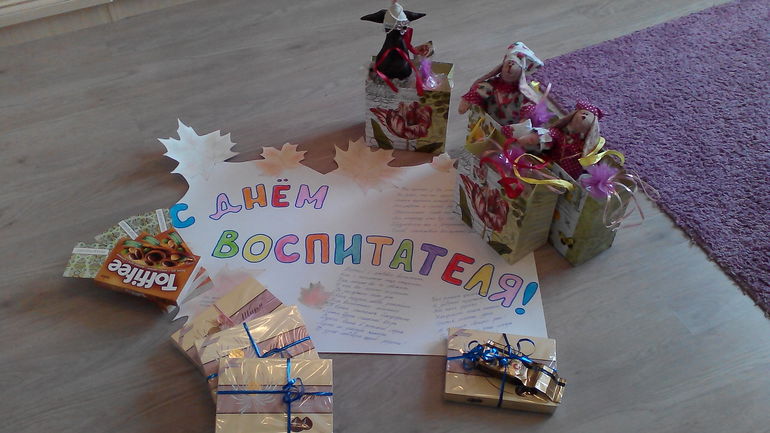 в спальню и букет из шаров. Чувствую зава подарок не возьмет. А так по ранжиру: 1/ нашим- конверт ( в нем каждой по 1 тр) +тоффи, стул, стенгазета (на этот раз скромно, нет вдохновения и желания, букет из шаров. 2/ зава- сумочка с манекеном+ набор эйвон- 175 р, 3/ ст метод- сумочка со сплюшкой+набор 4/ муз- сплюшка+набор, 5/ физ- просто набор ( ТА особо не проявляется в нашей садовской жизни). По распродаже, а именно по 32 руб взяла мармелад в шоколаде от Ударницы- набор с кофе (турик привез, такой не пью)+ мармелад- медику, остальные 3- кухня, дворник, охрана.