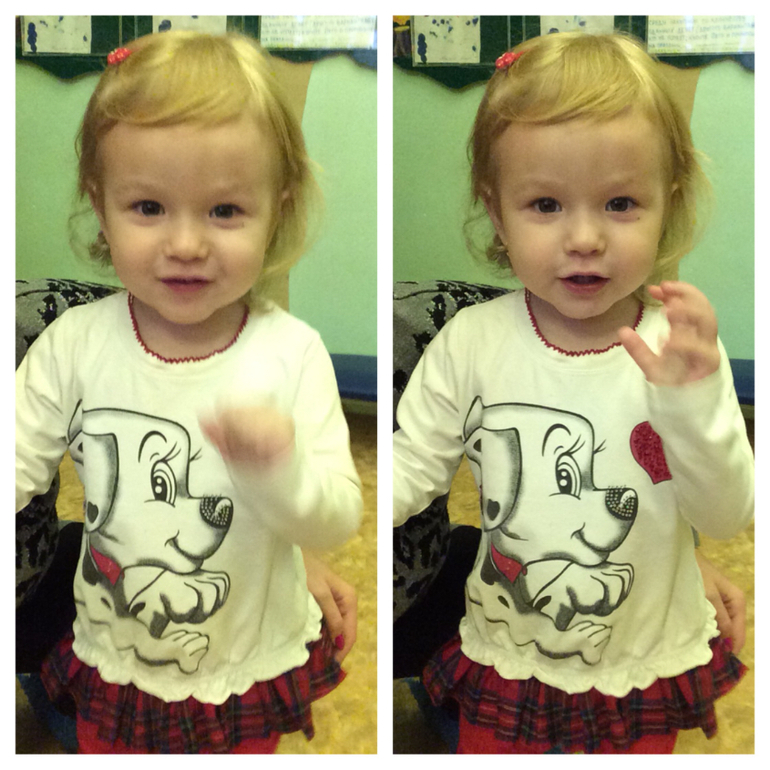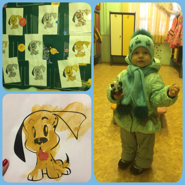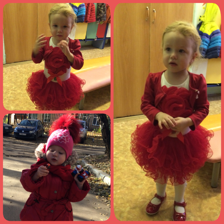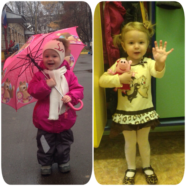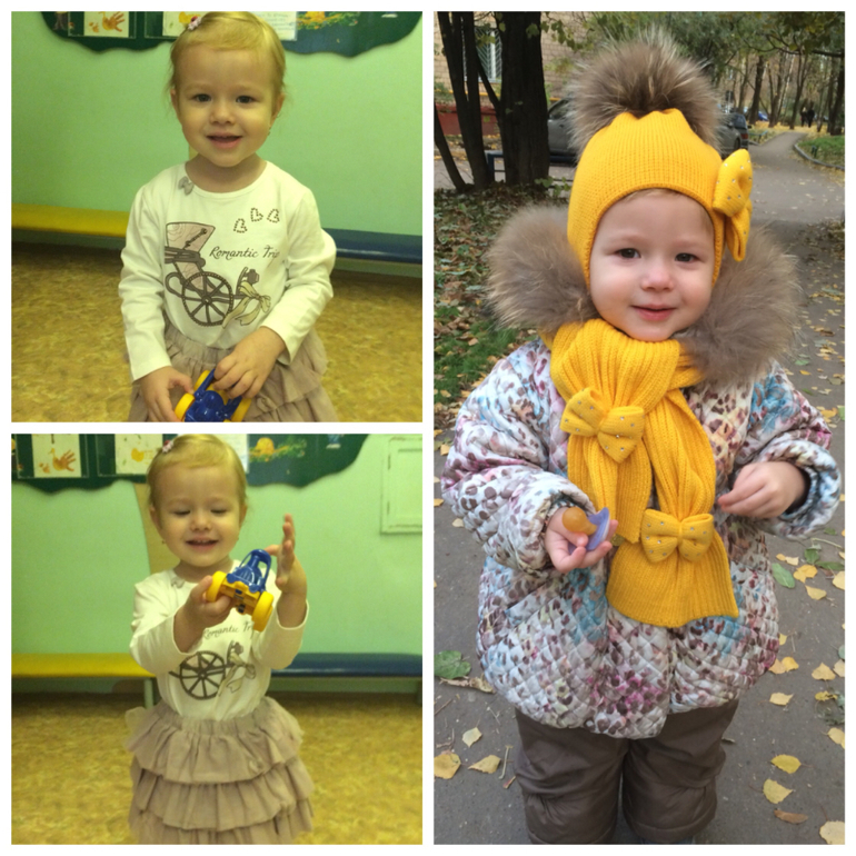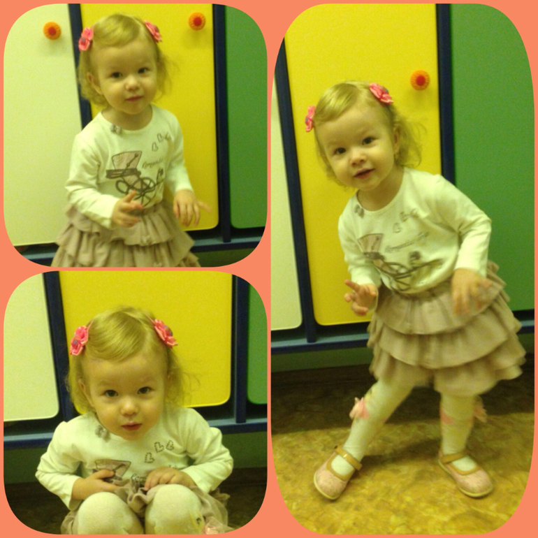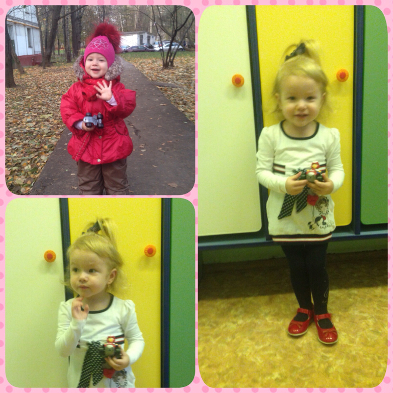 Пока мы привыкаем, первую неделю забирали в 11часов. После в 12часов, это уже после обеда. Пока мы плохо завтракаем, уже рисуем и лепим вместе со всеми. Играем, гуляем, ходим на все занятия. Машеньку хвалят))), оказывается не все детки, в общей массе возраст детей 3 года и старше, а нам 2,4, умеют разговаривать, работать с клеем, пластилином, даже ложку держать нормально.. Мы самостоятельные во всем, кроме одеться.., это нам пока не под силу.