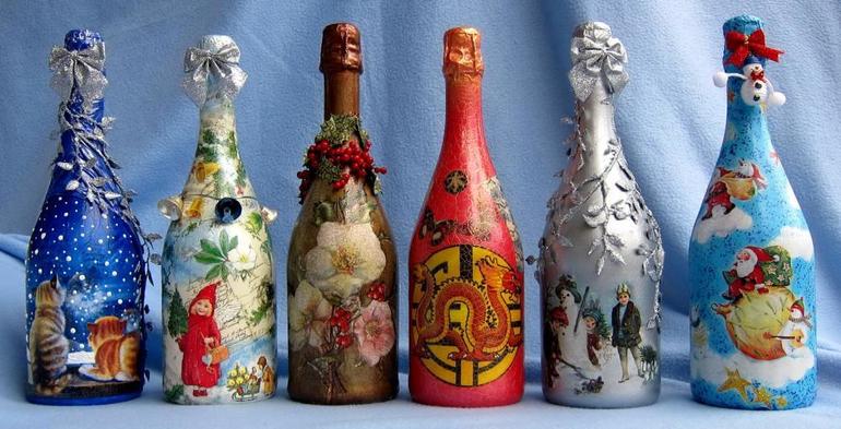 я дарю бутылку шампусика сделанную в технике декупаж.