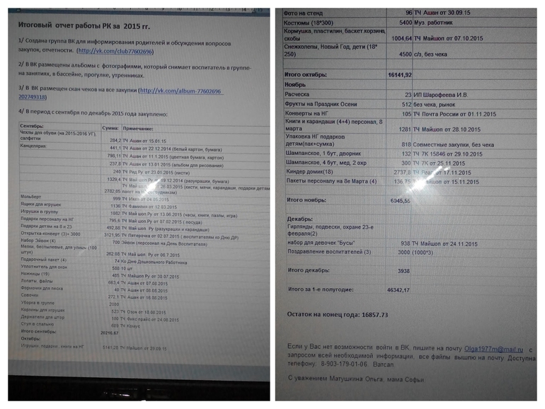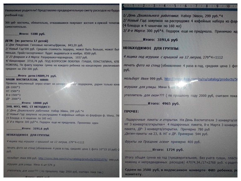 Вот это правильный подход. Потратил расписала все чеки приложил. А здесь правды не найти. Родителей не устраивает , что нет отчета о потраченных средствах , у нас в группе есть несколько семей которым тяжело сдавать сразу по. 1500₽ за раз и то собирают деньги за неделю.