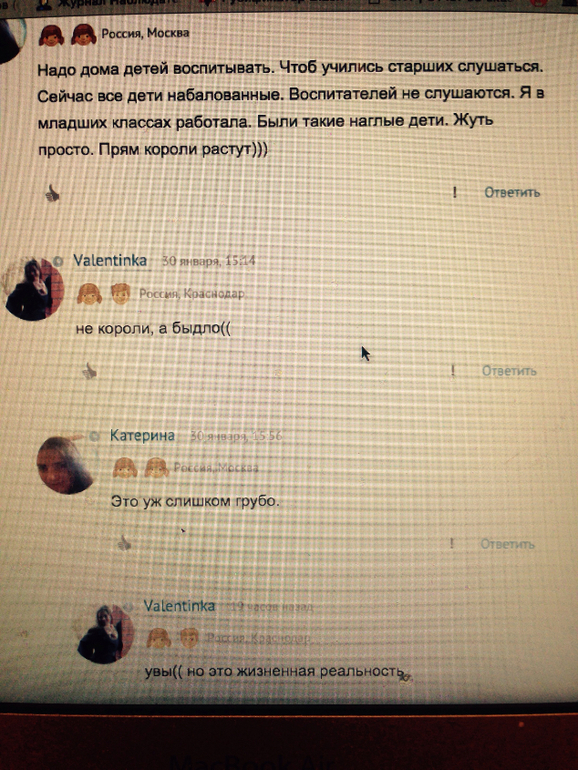 UPD: Сегодня разговаривала с вышестоящим руководителем, оказывается у нас тоже есть заведующая нашим корпусом, а есть еще руководитель всего комплекса... Когда я ей рассказала все наши "мелкие" придирки, в ее глазах они оказались очень даже "крупными", более того она была просто в шоке. Много вздыхала: "И чему их сейчас учат в эти институтах? Приходят молодые казалось бы - работай... Так нет..." Оказывается это уже не первая жалоба на воспитателей нашей группы, пообещала принять меры, оставила свой телефон, сказала звонить ей по любому малейшему поводу и все решать сразу. Говорит, что проведешь с ними планерку, месяц идеально, а потом опять жалобы сыпятся, нужно их постоянно держать в тонусе. Так что, мамочки, не надо бояться... Мне здесь в обсуждениях тоже один "педагог" пыталась навязать позицию, что садик это колония строго режима и иначе с детьми нельзя. Не ведитесь на это, отстаивайте права ваших детей! Всем спасибо!