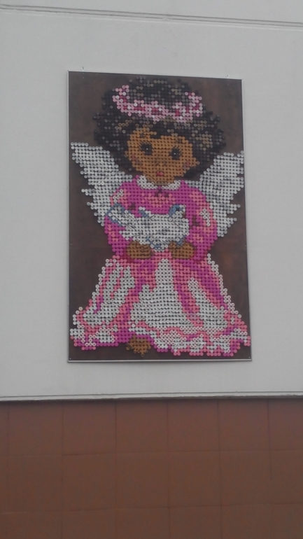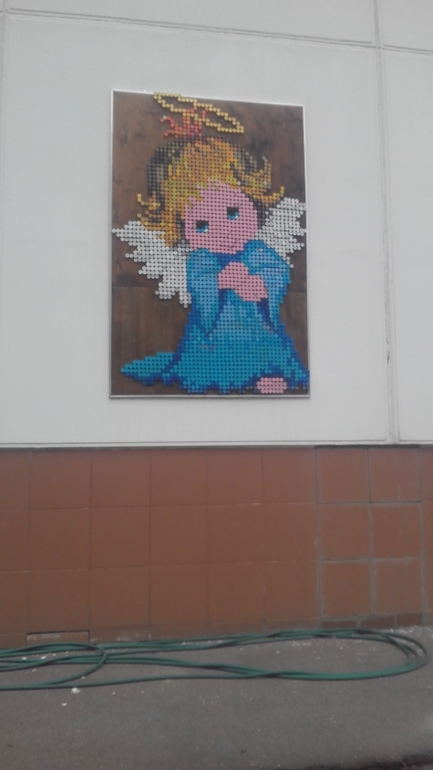 Пока ходила вокруг сада на стенах со стороны улицы увидела панно,которые сделаны из крышек от бутылок.Делала воспитательница