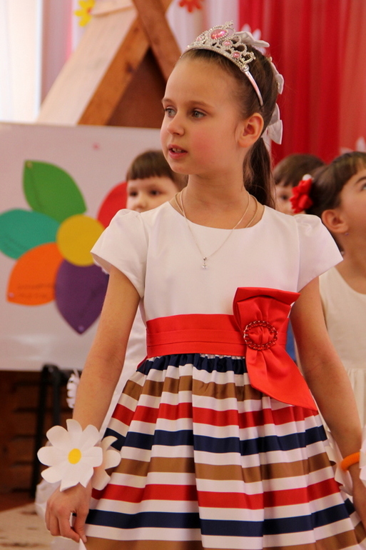 Кому то пришлось брать на себя роль организатора. Этот кто-то оказался - я. Срочно скооперировались, нашла подарки, все заказали. Сама сделала дипломы детям, благодарности воспитателям, открытки всем остальным. Все от дизайна, до слов. Сделала еще стенгазету в группу с фотками наших девочек. Праздник дети готовили уже сами с музработником. Здесь мы не стали ничего выдумывать дополнительно. Подарки получились скромные, но от души. Нас же всего четверо. Это когда вся группа выпускается, все скидываются, то можно очень приличные подарки воспитателям организовать. Мы "брали" эмоциями. И не ошиблись. Воспитатели расчувствовались, мы тоже все всплакнули чуток. Праздник был шикарный, очень хорошо подготовили. И было все отдельно ради наших выпускников. Конечно, некоторые родители все же выделились. По-видимому, решили, что раз праздник их детей не касается, то и парится не надо. Пришли далеко не все. Некоторых детей даже не потрудились прилично одеть. Футболка, шорты, чешки... К чаю после праздника тоже не особо постарались что-то организовать. Ну, да ладно, это мелочи. Мы довольны, наши девчонки тоже. На празднике Саша была принцессой.