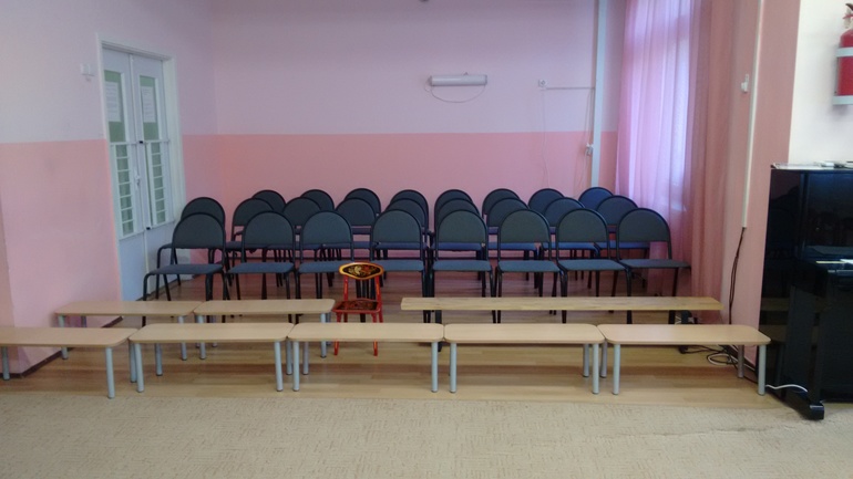 Так же мы учли ошибки выпуска первой группы и постарались немного решить проблемы с местами для зрителей. В зале 5 рядов стульев по 9 штук, т.е. всего 45 мест для зрителей, а это меньше чем 2 места на 1 ребенка! В итоге мы решили убрать первый ряд стульев и заменить его на 2 ряда скамеек, ряды уплотнить немного и после последнего ряда оставить стоячие места. Итого по нашим оценкам должно поместиться минимум 60 человек!!! маленький стульчик в центре, это место для оператора)))