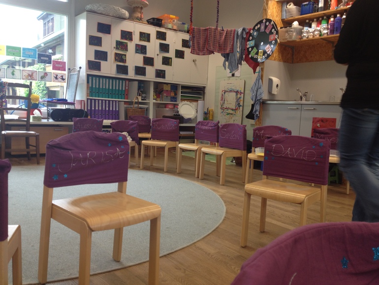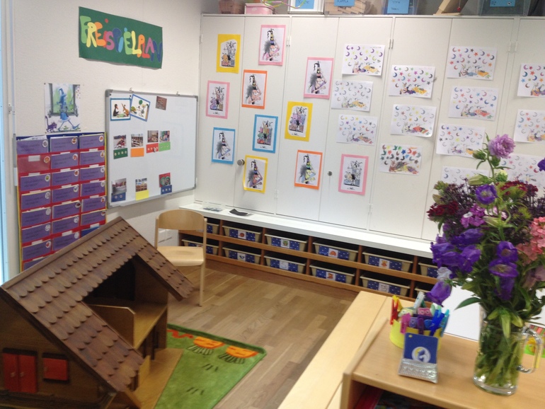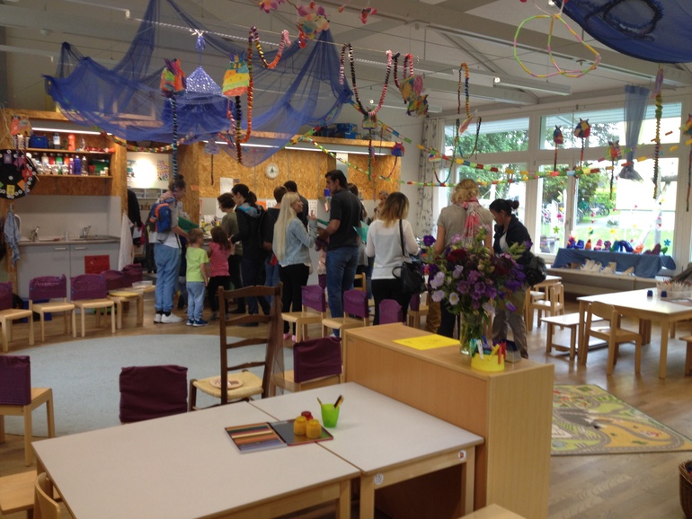 там 2 группы. у каждой свой учитель и ассистент учителя.пришли- всех детей посадили в кружок на стулья, родители сзади. мой ни в какую не хочет садиться в круг на стул... Все дети играли в какую то игру. потом всем раздали папки с инфо . Можно было ходить по всюду и все ссмотреть и трогать. потом надо было раскрасить свой значок на гардероб ( моему досталась белка)