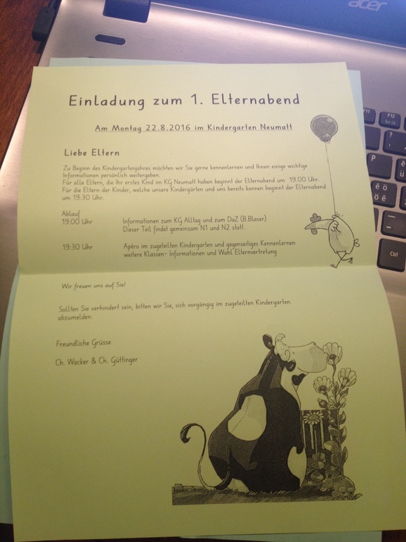 вот уже и приглашение на первое родительское собрание есть... Написано- в 19.00 информационная часть, а с 19.30- аперо- то есть выпить и потанцевать, я полагаю...