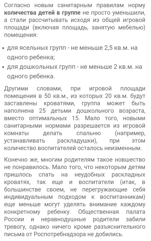 Площадь, которую "съедает" мебель в групповой не учитывают, когда распределяют детей. Например, группа 40 квадратов. Поставили пару шкафов, столы, игрушки крупные - и уже минус 10-15 метров от площади. А детей то в реале больше.