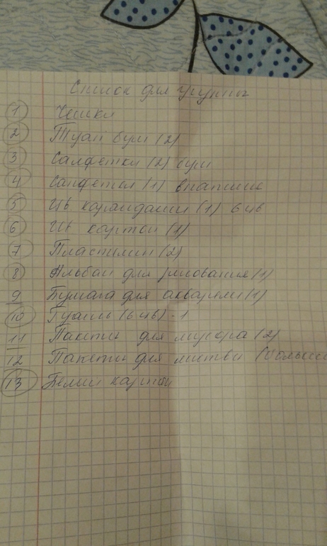 В связи с этим хотела у Вас спросить - Есть ли у кого то список необходимого для группы в садике.? Вроде слышала, что кому то сами воспитатели дают целый список, что надо покупать (хоз.нужды, канц. и т.д.). Хочу сама все это покупать, рассчитать сколько прим.надо одному ребенку (если получится конечно)...... Заранее всем ответившим большое спасибо!!!