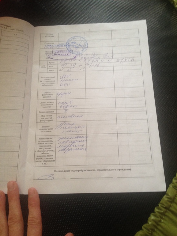 Карта должна подписываться педиатром, заведующим поликлиники и должны стоять печати и штампы поликлиники