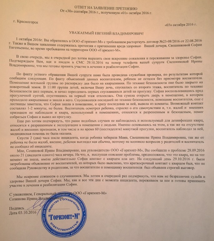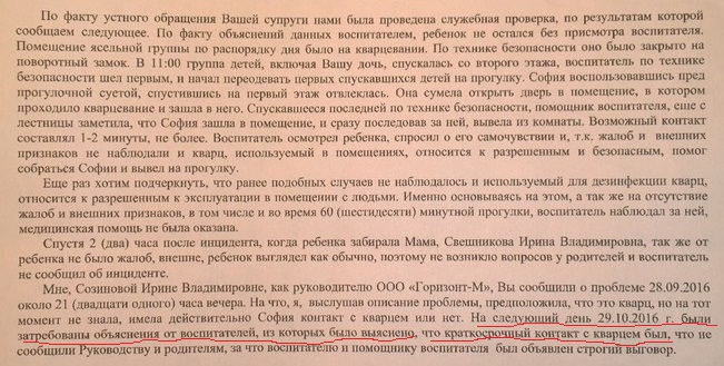 Ирина Владимировна, хватит пожалуйста! Мы как и во всех документах у вас и в репортаже рен-тв не отказывались тот помощи вашей семье! Мы в отличие от Вас не заливали регулярно интернет грязью! Мы помогаем вам как можем! Наш садик проверяли все! Начиная от Следственного Комитета заканчивая правительством московской области! И все проверки ещё в ноябре подтвердили нашу невиновность! Что вы ещё от нас хотите?