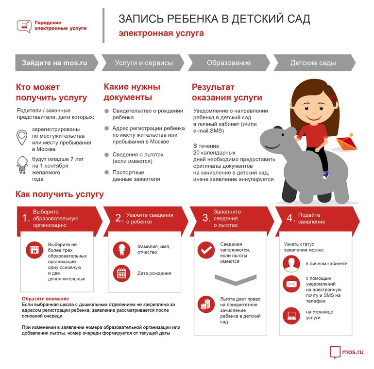 Добрый день, Татьяна. Вы можете подать заявление на зачисление ребёнка в детский сад на сайте mos.ru. Для этого необходимо зарегистрироваться указав свой логин и пароль. Подача заявлений от незарегистрированных пользователей не предусмотрена. Для заполнения интерактивной формы необходимо ввести сведения о ребенке (ФИО, реквизиты свидетельства о рождении, адрес регистрации ребенка по месту жительства или месту пребывания в городе Москве), информацию о льготах (при наличии), указать желаемый год поступления и выбрать от одной до трех организаций. Дополнительную информацию можно получить в Центре информирования населения о предоставлении образовательных услуг Департамента образования города Москвы по тел.: +7 (495) 530-71-71, понедельник - пятница с 9.00 до 19.00 (суббота, воскресенье - выходной), а также по электронной почте infodo@edu.mos.ru. Также рекомендуем ознакомиться с приложенной инфографикой.