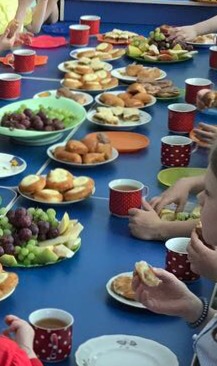 У нас в кафе будут наггетсы, картошка-фри, бутерброды, фрукты (бананы, мандарины, сливы). А по опыту дети съедают как раз сначала все сытное, а потом уже торты-плюшки