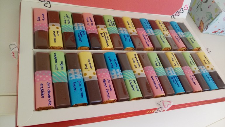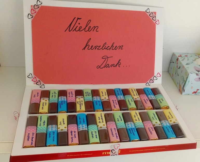 Сделано по принципу "100 причин..." На каждой конфетке маленькая благодарность за что-то хорошее: " Большое сердечное спасибо за доброту, за ваш юмор, за теплоту" и т.д.