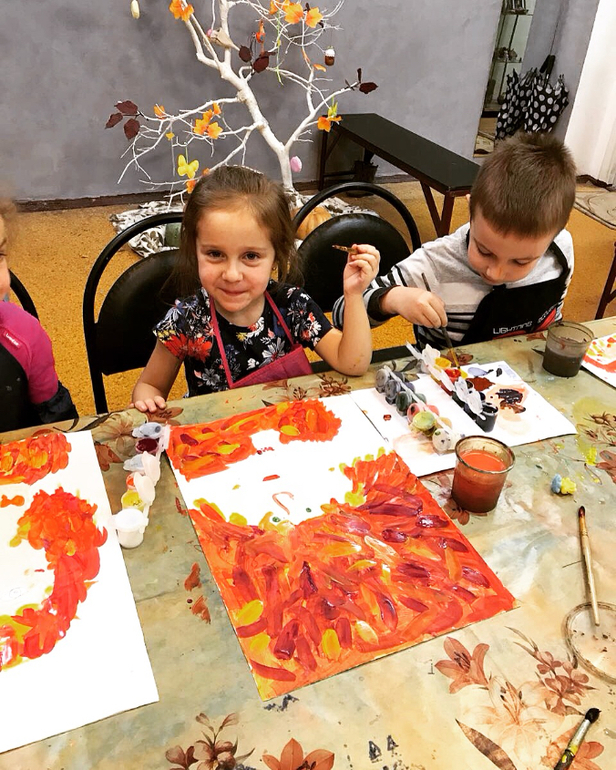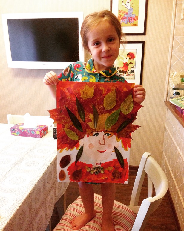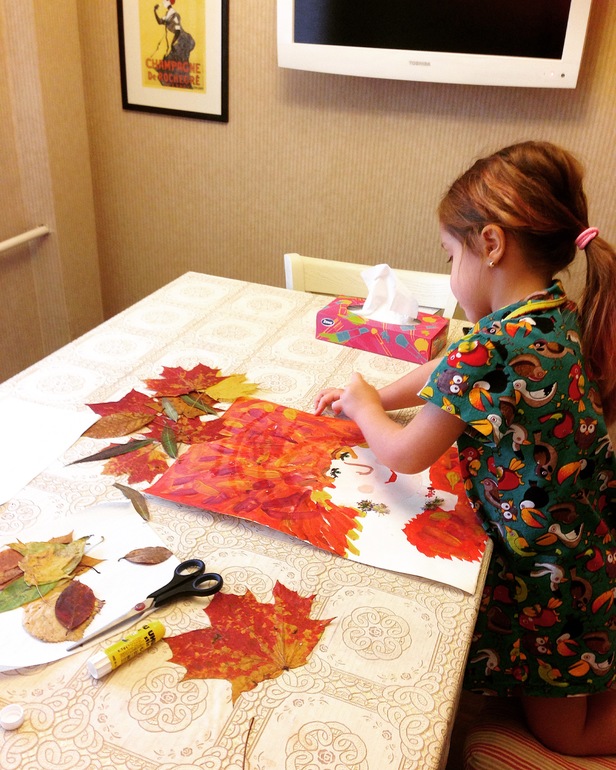 ПотрындетьЯ только прогладила листья утюгом, подсказывала куда клеить и жёлтой крепбумагой фон обклеила в рамку.