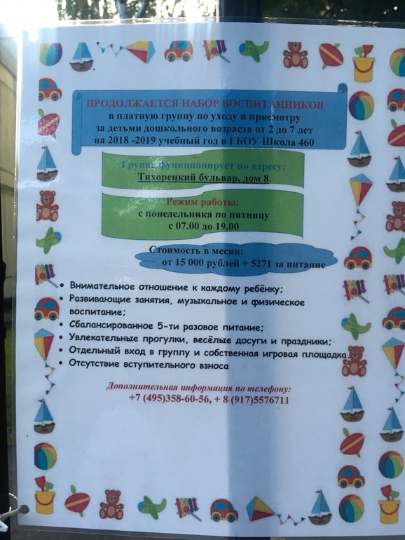 Я цене поразилась,гос учреждение,аренду платить не надо, деньги в департамент ( знаю воспитателю там мало капает )у нас есть в комплексе такая группа. В позапрошлом году соседи платили 7 тыс и 4-5 за питание. А столько народу в Москве буквально из соседних областей.