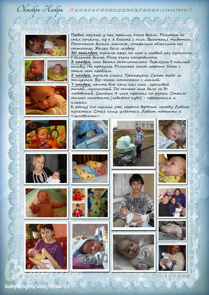 Красиво, очень нежно. Я тоже распечатываю на А4, и по этому поводу если позвольте несколько замечаний. 1-е нужно уменьшить колличество фотографий ( можно разбить на 2 странички или даже больше ), т.к. они будут при распечатывании очень мелкими, ничего не рассмотреть... 2-е почти все фото нужно немного осветлить. И календарь как то непонятно читается, можно октябрь поместить как у вас вверху, а ноябрь тем же шрифтом внизу и просто выделить числа.