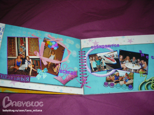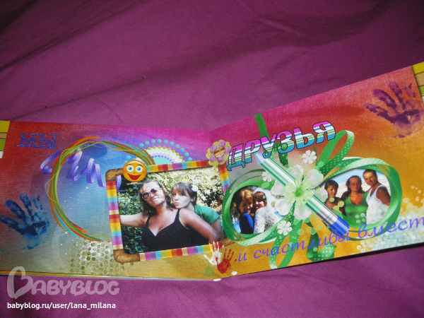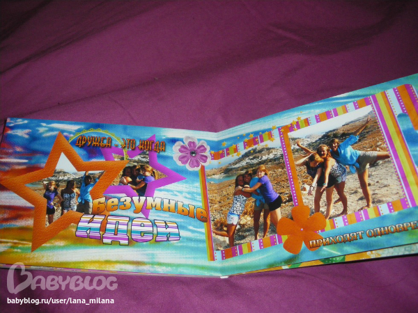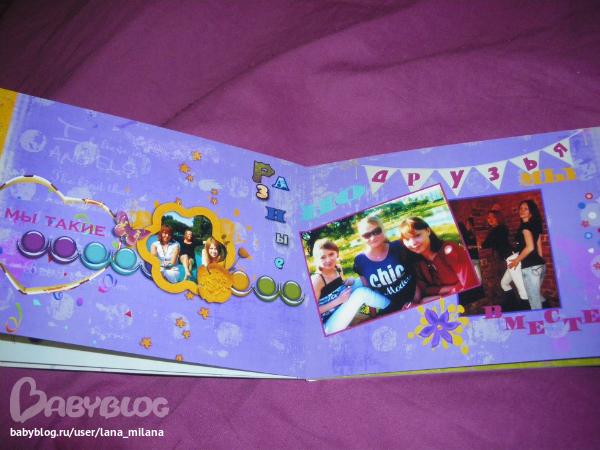 СтраничкиВот такая веселенькая, яркая книжечка получилась для такой же девочки, делала ей сразу три книжечки, одну love story, вторую путешествие в Грецию и эту книжечку о дружбе, все покажу в порядке очереди)))) Помню, что еще должна показать тайскую церемонию сестренки, все покажу)))) Обладательница книжечек радовалась как ребенок, первый раз видела такой дикий восторг, как же это приятно, когда твоему подарку так радуются, когда такие искренние эмоции, даже прослезилась