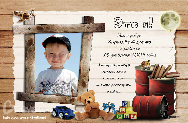 Хочу показать одну работу. Это альбом-знакомство с ребенком, сейчас их называют Портфолио. Правда, не совсем дошкольника, а... до-дошкольника))) Я сделала этот альбом для младшего сына Кирилла, который этой осенью в первый раз идет в детский сад. Все, что он любит-не любит, кушает, полезные навыки, острые углы... В общем, инструкция по применению)))