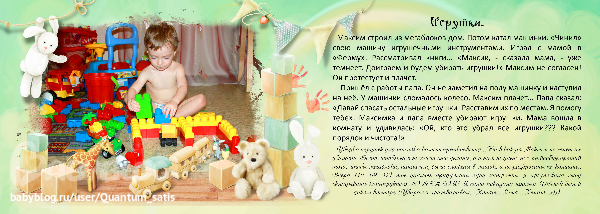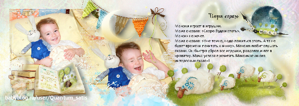 Законченные проекты (Скрап-альбомы, календари и пр.)Прилетел ко мне на почту скидочный купон от принтбука на минибук 13 на 18. Скидки - это всегда хорошо, да вот беда - действителен он всего две недели... А хотелось успеть воспользоваться! Надо было скорее браться за дело! Думала я пару дней над темой альбома, размышляла....и вот, что надумала: сделать маленькую книгу сказок для моего малыша, чтобы в сумочку помещалась. Скажу ещё, откуда текст мини-историй, чтобы не покушаться на авторство...Несколько месяцев назад я увидела в "Лабиринте" серию книг с маленькими сказками-ситуациями, в которые при чтении надо подставить имя своего ребёнка. Заказала на пробу - а оказалось, что сыну они очень даже по душе! Автор - Дарья Колдина. Немного изменив текст под фотографии или имеющиеся у нас проблемы, я и создавала наши с Максиком сказки.))) Стихи взяты из сети.