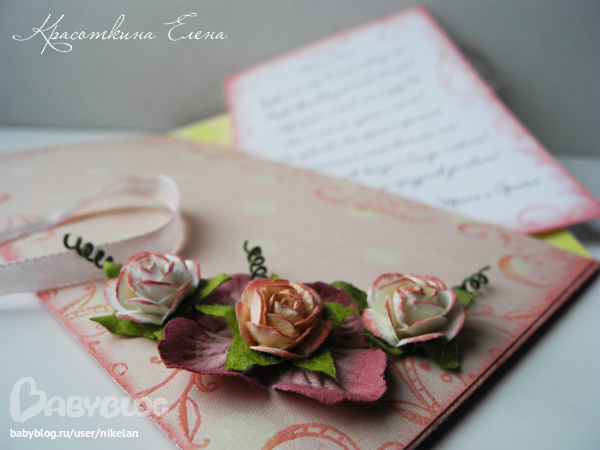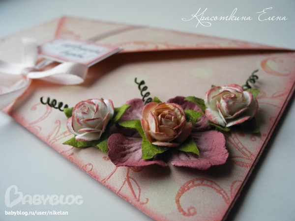 Из материалов: двухсторонняя бумага, горячий эмбоссинг (я его очень люблю), штампы, чернила, бумажные цветы, атласная лента...