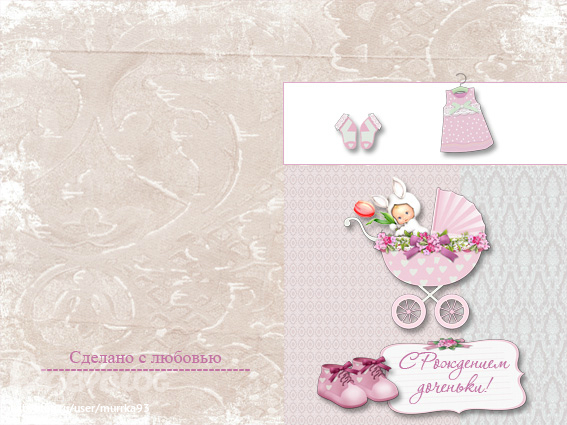 Обложка для розовых элементов не подходит по цветовому сочетанию совсем... Я бы заменила на какой-нибудь нежный тон не бросающийся в глаза. У вас акцент открытки на коляске я так понимаю, а в глаза бросается все и сразу. Насчет текста внутри - он не должнг заходить на элементы с тенями, сначала текст потом виньетка. И тени везде сделать светлее - слишком темные. А в целом для второго раза неплохая открыточка :)