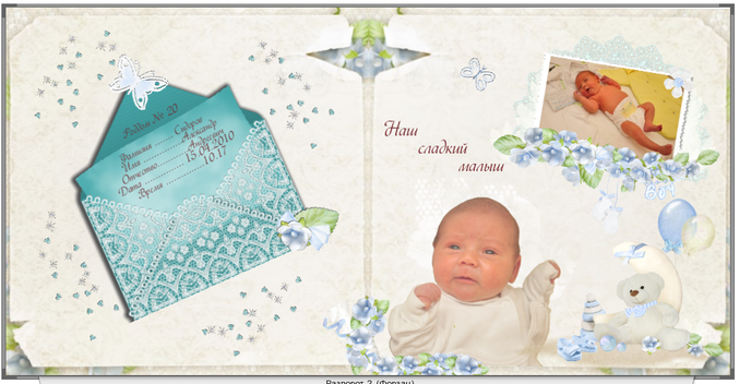 Ну а если все-таки вы пока не готовы начать освоение программы Photoshop и хочется быстрее закончить книгу о малыше, то это можно достойно сделать и в Принтбуке. На мой взгляд, главное, это не переборщить с декоративными элементами, ведь главный герой вашей фтокниги - ваш ребенок, а соответственно фотографии с ним, уделите им большее внимание.
