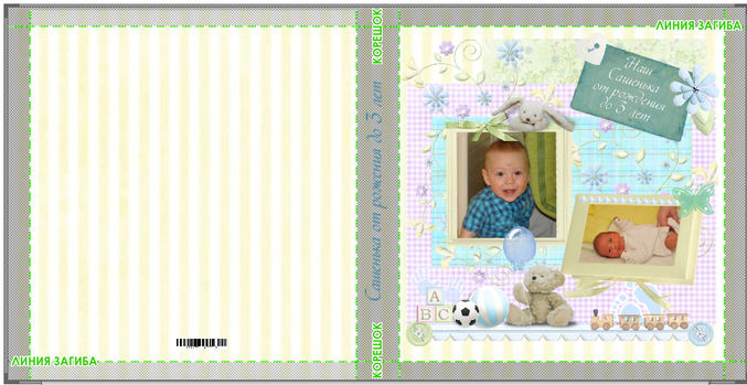 Доброго времени суток, девочки! Я в ступоре! Помогите! Рассказываю: Затеяла я тут альбомчик своему сыночку ... Скачала принтбук.... сделала по шаблону ... поняла что это полное БЕ... Проштудировала инет, накачала скрапов и влюбилась... начала шлепать странички... сделала почти полкниги ... фантазия кончилась... решила примеры посмотреть... попала к вам и поняла что я лузер.. ПОМОГИТЕ!!! ПОСОВЕТУЙТЕ!!! Выкладываю обложку и 1 разворот: