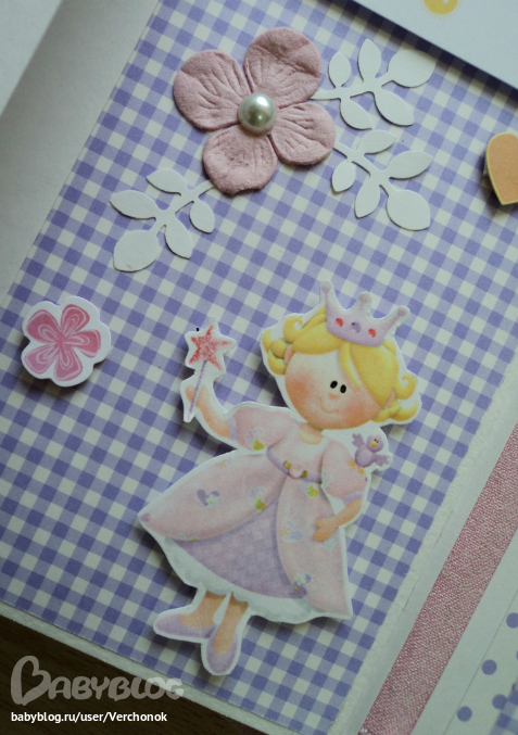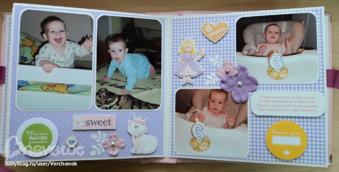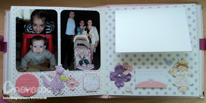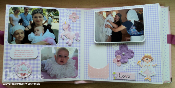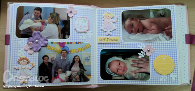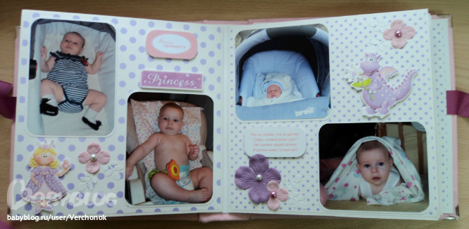 Ох..добралась я наконец-то сюда, чтобы выложить последние работы!! Заказ был для двух сестричек Анечки и Софьи. Анечка- младшая, Сонечка - старшая. Начнем с альбома для Анечки. Формат 20*20 см, 8 разворотов, есть места для подписей, таблички рост-вес, на некоторых страничках - кармашки с бирочками для записей. На обложке заказчица сама разместит фото в рамочке (рамочкаприлагается к альбому).