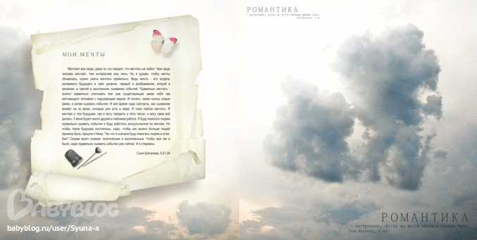 Сочинение на заданную темуВот и я наконец-то доделала разворотик. Долго подбирала стихотворение, чтобы оно сочеталось с первым разворотом. Наткнулась на потрясающее эссе о мечтах, надеюсь вы не будете против? Еще вопросик: бабочка на страничке не лишняя?