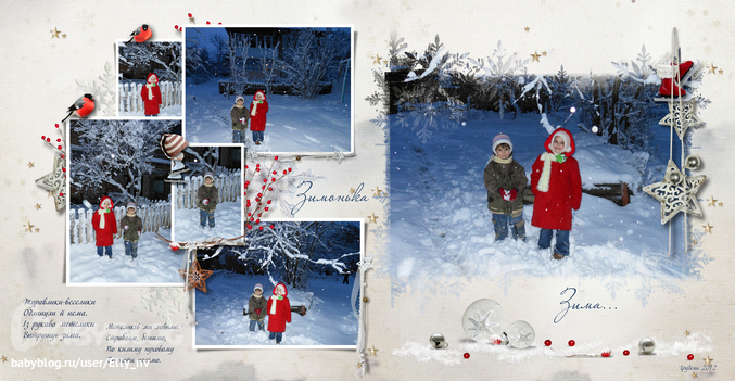 мне разворот нравится, но по композиции хочется подвигать: 1. левую часть отразить по горизонтали или чем-то закрыть дырку, где стоит слово Зимонька. Можно закрыть более объемным и большим заголовком в цвет фото 2 стихи тоже хочется упорядочить - тоже дырка наблюдается в углу, которую образуют два текста.. Или их в один столбик попробовать, или в эту дырку тоже что-то добавить в цвет фотографий, чтобы не бросалось в глаза..