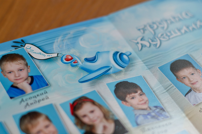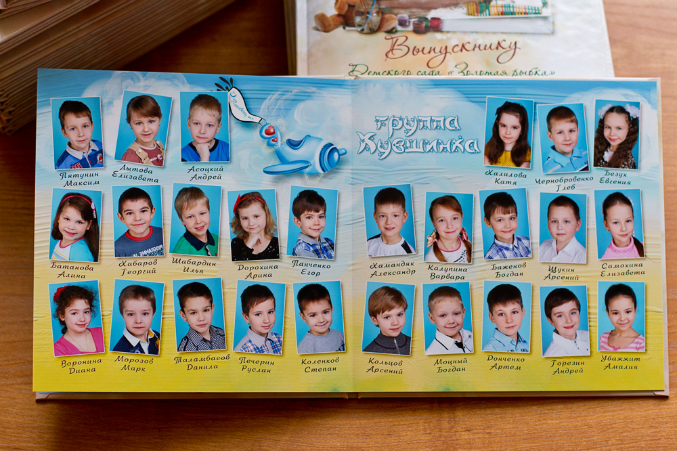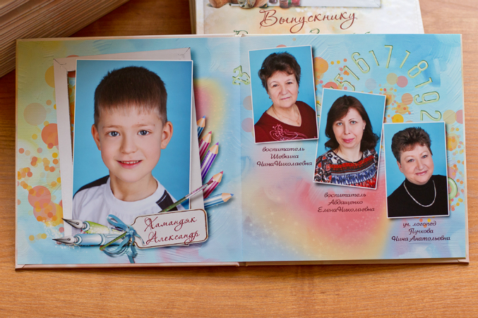 Да, на первом развороте индивидуальный портрет, на последнем репортаж для каждого ребёнка.