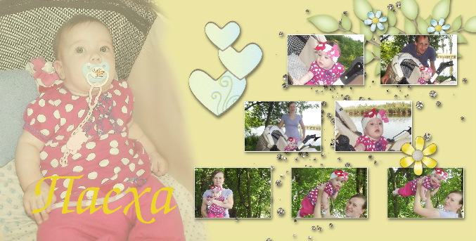 3. Второй разворот: надпись Пасха желтая вообще не в тему, на ребенке блендинг не нужен, вся прелесть девочки сразу скрывается под огромной надписью и бежевым фоном. Сюда подошел бы оттенок свежей зелени в тон основной массы фото.