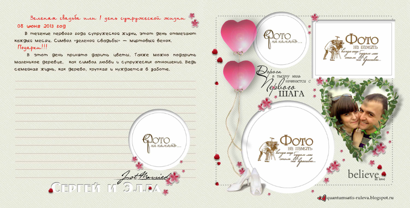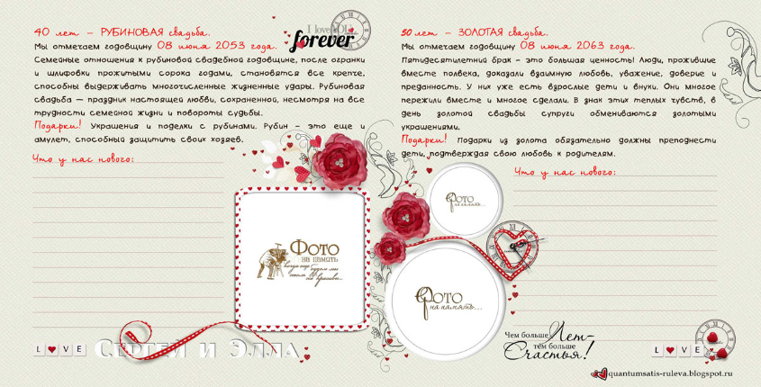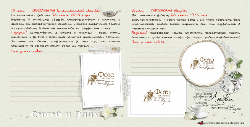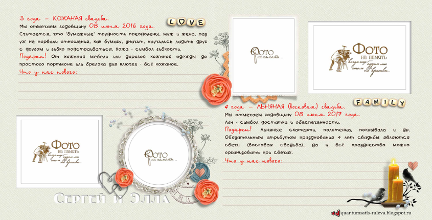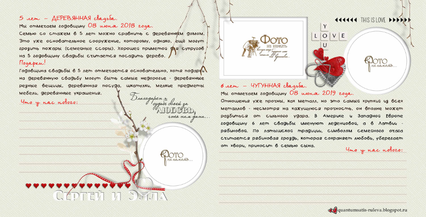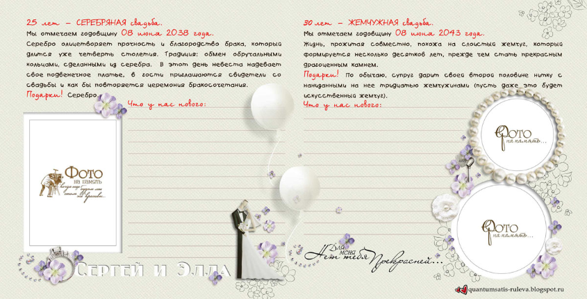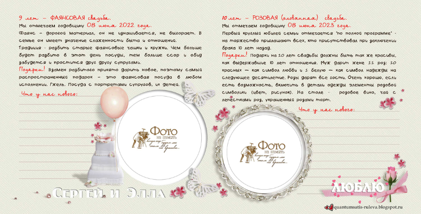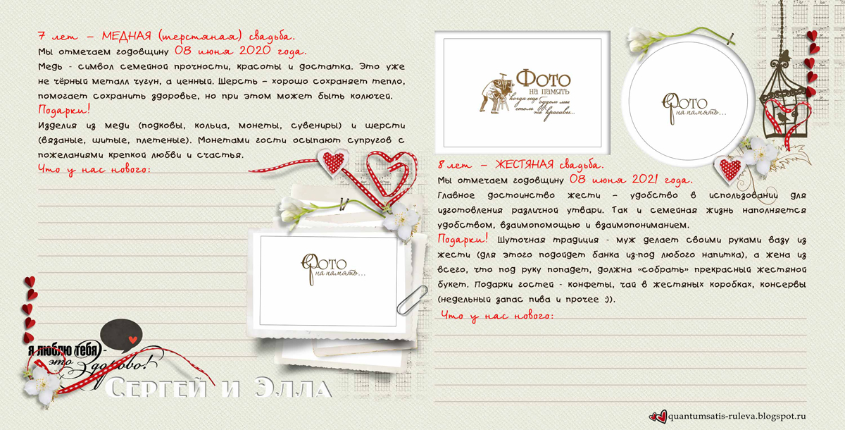 Много нового узнала о годовщинах свадеб и традициях их празднования, о том, что принято дарить... Захотелось и себе такую книгу-напоминалочку и обязательно следовать написанному! Итак, смотрим. 10 разворотов, формат 20 на 20 см. Cтаралась, чтобы элементы декора не заходили на места для фото, выделенные контуром.