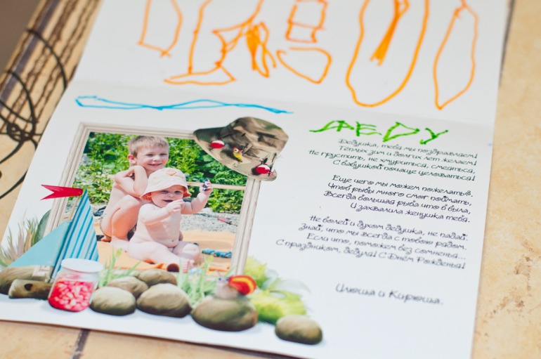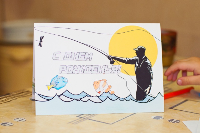 Гибридные проектыТак повелось ,что на день рожденья мы каждый раз дарим открытки бабушке и дедушке. А на юбилей 60 лет вообще грех было не подарить. Дедушка Аркадий у нас страстный рыбак. Основной подарок от нас -лодка, поэтому и открытка ,естественно, "рыбацкая". Я за полчаса сделала внутреннюю часть открытки, подобралаи переделала стихотворение. Внешнюю же пришлось делать полиграфической (потому как двухсторонней бумаги у меня не нашлось). Поэтому я нашла клипарт рыбака, а отдельно на глянце распечатала рыб, волны и надпись.