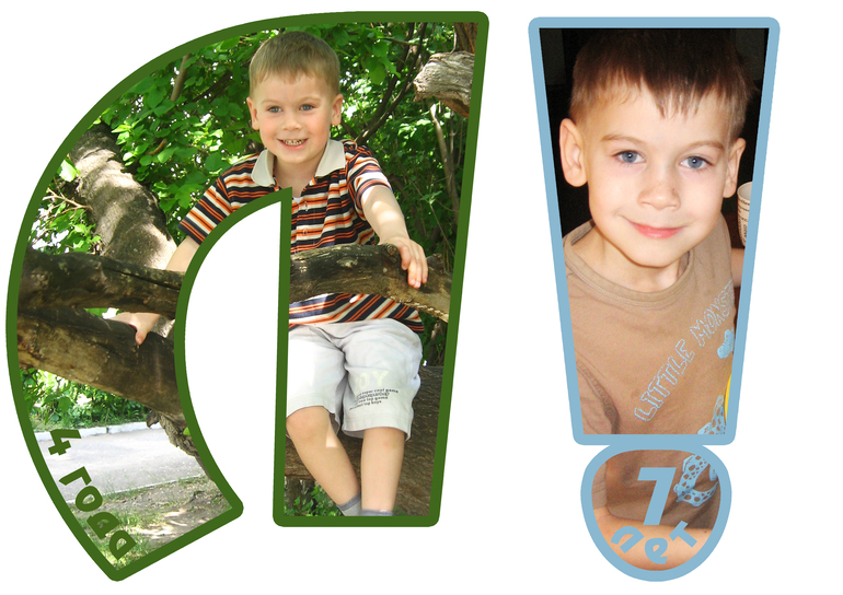 Шрифт AGRevueCyr, немного деформировала перспективой, расширив символы вверху. Ну и отверстия в буквах закрасила. Фото от рождения до 7 лет, разноцветная обводка.