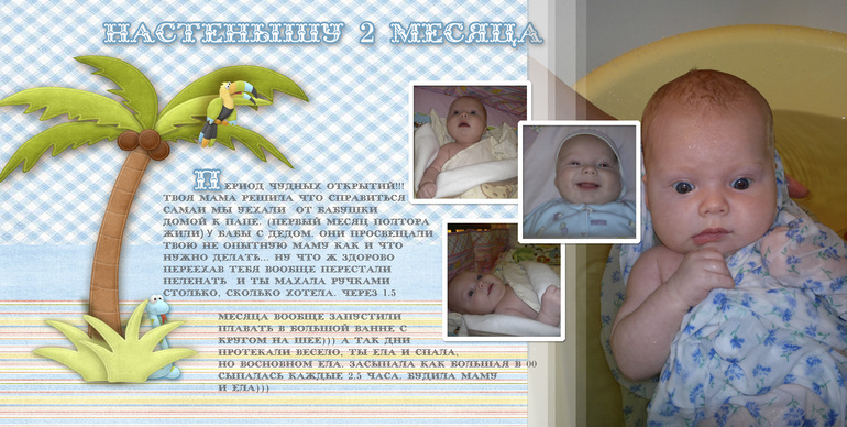 У вас вокруг пальмы слишком много неиспользуемого пустого места, а 3 фото слишком находят на большое. пальму смело можно задвинуть половину за "кадр" (честно говоря, не совсем понимаю, к чему тут пальма??? Можно ее заменить на распашонки-соски, пинетки), если речь идет о ванне и купание, то... пальма тоже не совсем уместна. Шрифт текста поменьше, шрифт заголовка можно сделать рукописным, не нужно использовать так много узорной бумаги — на ней и текст плохо читается, и вам еще нужно поучится с ней работать.По цветам — на фото есть сине-голубой, я бы элементы добавила салатовые и розовые, страничка совсем бы по-другому смотрелась.Фотографии очаровательные, можно сделать из разворота шедевр, но пока не хватает знаний (это не страшно, все мы когда-то начинали), вам нужно больше ходить по галереям, складывать понравившиеся работы в папочку, а потом лифтить, чтоб набить руку.Все приходит с опытом.)Вдохновения вам!