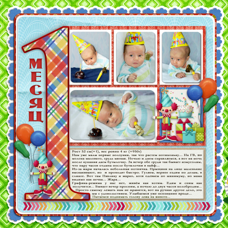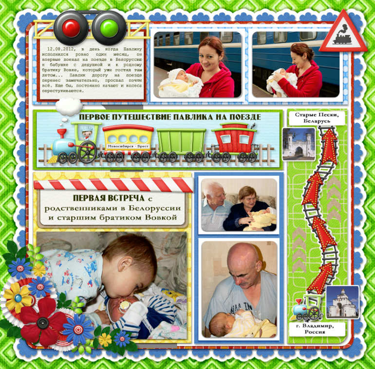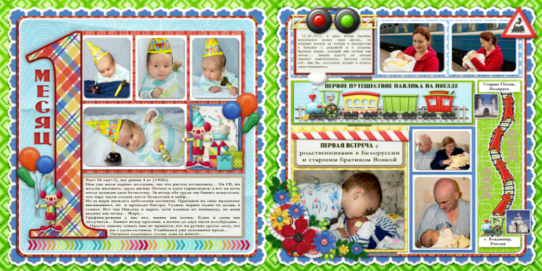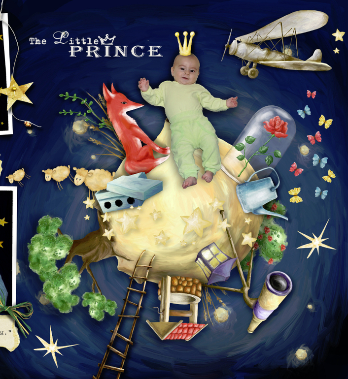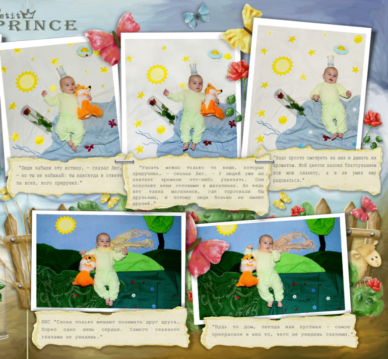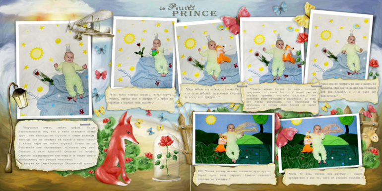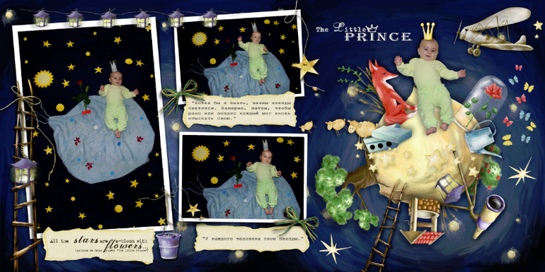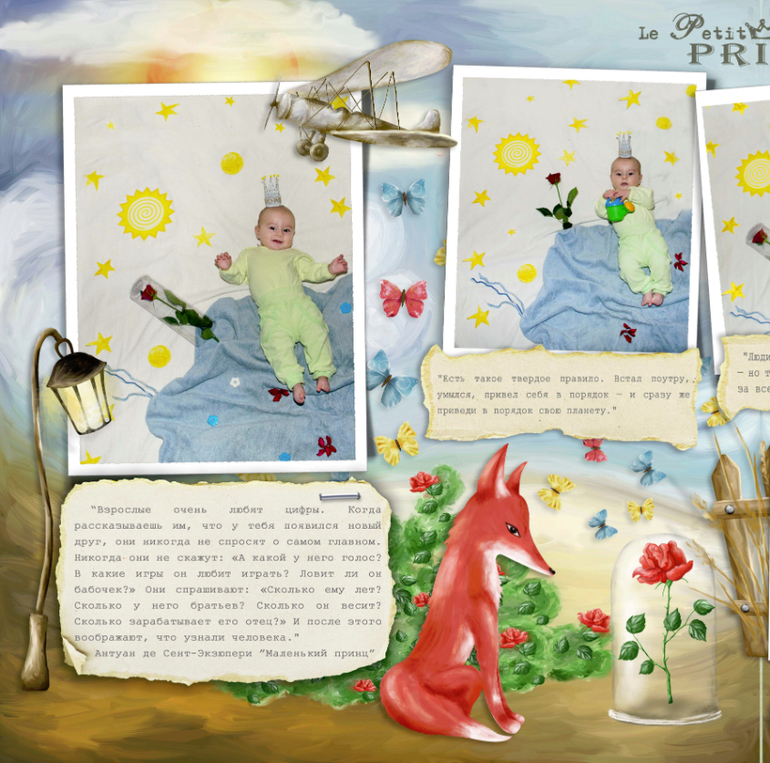 Помогите советом (критический разбор работ)Ну наконец дошла до одного месяца... Впереди еще одиннадцать... Что то тяжко идет... Ничего не нравится... С разворотом в псевдобумажном стиле сижу по 2-3 дня... Пока подберешь композицию, бумажки, элементы... Такими темпами успею только на следующий год книгу по акции заказать... После одного разворота в псевдобумажном стиле решила отдлхнуть и взяться за любимые фотки в стиле маленького принца... Вроде и подходящий набор был, но все равно сутки просидела...