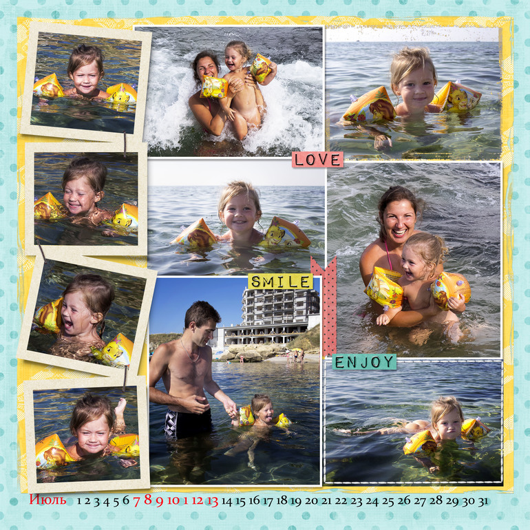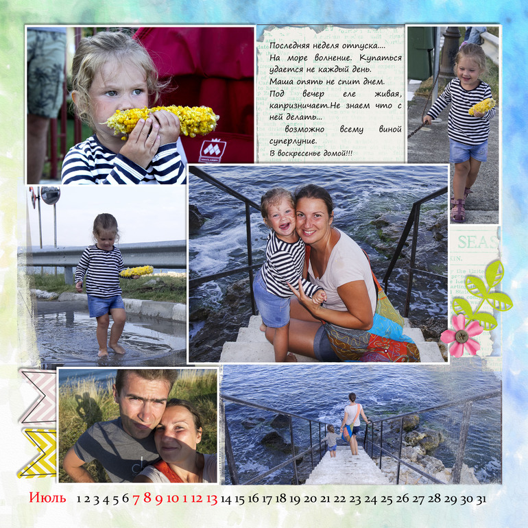 СтраницыМобилизовала свои силы и твердо решила догонять!!! Уже на носу новый проект, а я все на отпуске застряла. Еще хочу сделать одну про море с подведением итогов отдыха - в основном текст будет. И вперед к осени двигаться буду, благо дальше фотографий в разы меньше! Вот несколько страничек отпуска. Лето, лето....