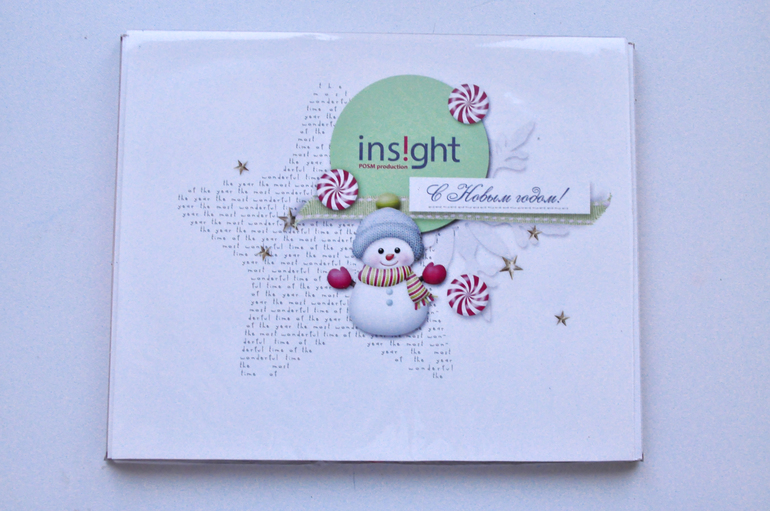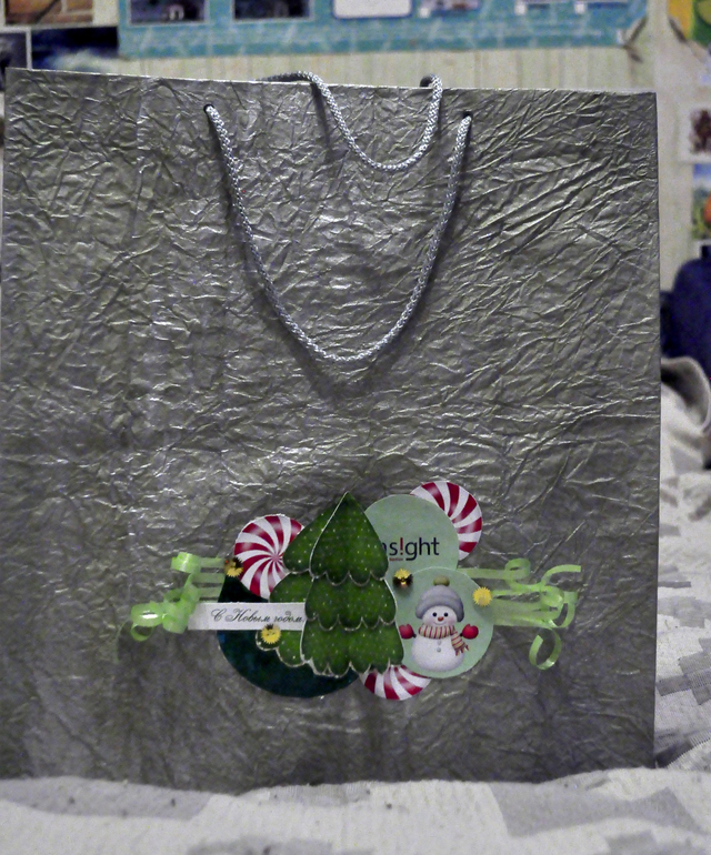 Элементы вырезаны и приклеены на двусторонний скотч, прошить уже готовый пакет не представлялось возможным:) С той стороны, где надпись С НОВЫМ ГОДОМ - круг из голографического картона. Это не рисунок такой. Золотые звездочки на объемный скотч прикреплены. Елочка объемная.