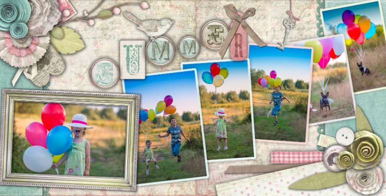 У меня, когда смотрю на развороты, совершенно не соединяются вместе наборы и фото. Фото яркие и красочные в большинстве своем, а набор приглушенный, винтажный. У той же Ким можно найти наборы, которые идеально подойдут под эти фото. Особенно это заметно на развороте с шарами. Там нужен яркий набор в цвет шариков. Про тени и про взгляд уже девочки написали.