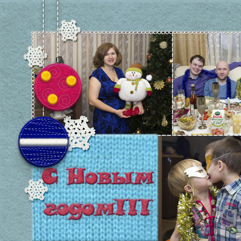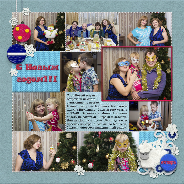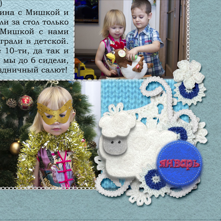 Тепло и уютно!!!мне нравится!Но надо что-то делась м заголовком "С Новым годом!" И Январь" не могут они быть такими при фетре и вязании.А еще вязанные кусочки я бы все-таки под фото положила, а не на.....чтобы край смотрелся натурально... Вернее не смотрелся ненатурально. В реальности ведь край вязания так не выглядит?:)