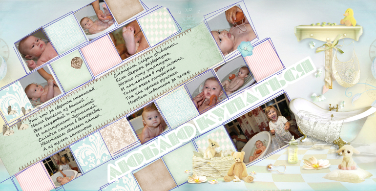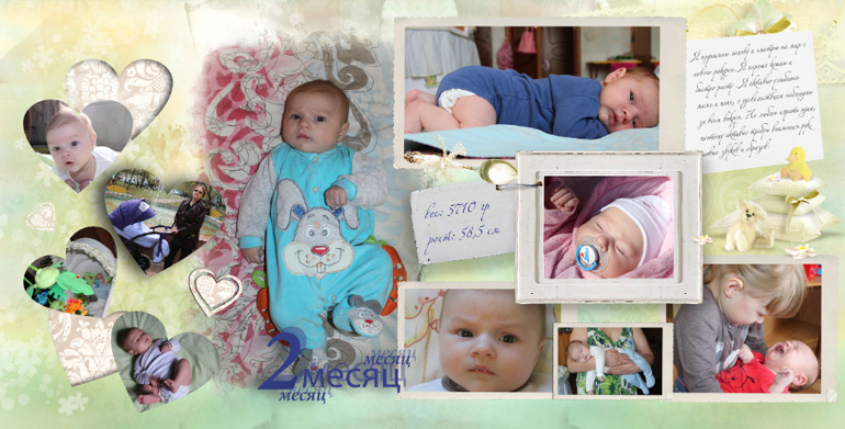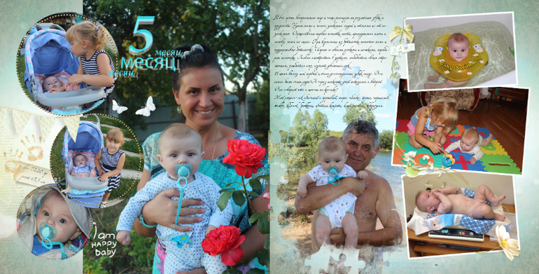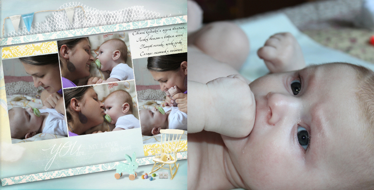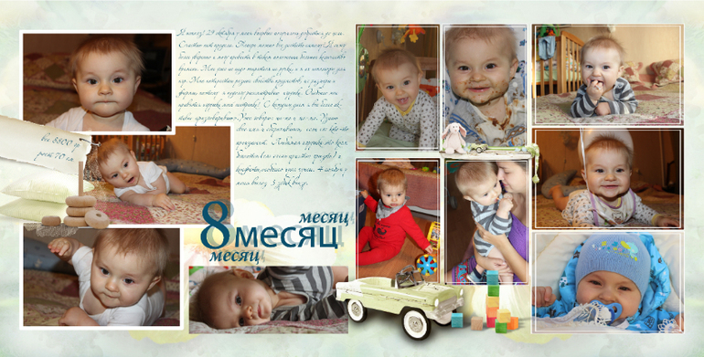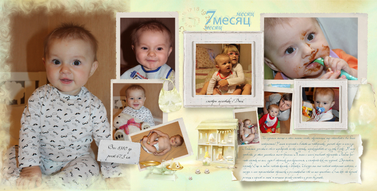 Очень большая работа проведена- замечательный альбом!!!! А главное память!!! Хорошие позитивные фото, элементы подобраны в тему))) Замечательный малыш))) Мои замечания- тень от букв не должно быть ( тут он же рукописный- те нет от него тени, это замечание часто пишут). Можно добавить белую по контуру обводку на цифры или важные фразы, тогда и тень будет уместнее, те эффект вырезанных букв будет. Тень от элементов хотелось бы вниз ( например на гирьках во втором развороте- сделать тень как у медвежонка- более реалистичную, чтобы тень ложилась на "пол").И конечно же проверить чтобы линия перегиба разворота не попадала на лицо.