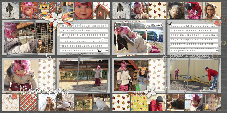 2 разворот: слишком много всего. Когда фото пестрят - элементы наоборот должны минимизировать в данном всём. Текст в правой части не попадает на строчки белые) и мрачноват фон в целом, серый :(какой-то жизнерадостный надо к таким веселым фотографиям - розовый или бледно желтый, голубой... Элементы цветы ...цветы это когда к летним фото или к портретам, а тут зима, надо зимние элементы передающие картину в целом опять-таки.. Так сверху рамок органично смотрится как будто он приклеен сверху, то есть объемен и имеет тень имитирующую наложение на это всё.