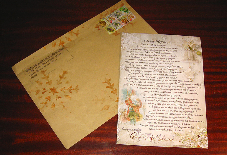 Снежинки проштамповала губкой, золотым акрилом через вырезанный трафарет, адреса отправителя и получателя (получателем указала сына) распечатала и перенесла на конверт через копирку, с помощью синей копирки дорисовала штампы на марках, отклеенных со старых конвертов на работе :-)) Конверт ночь подкинули в ящик и подыграли так, чтоб именно сын его достал.